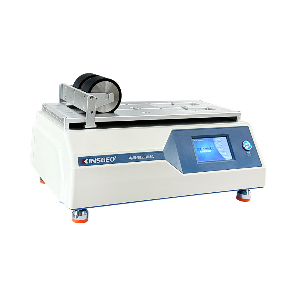 電動碾壓滾輪用于膠粘帶剝離強度、持粘性等試驗用試件的制備。以固定的壓力及速度,將膠粘帶試樣規范平整,均勻的粘著于標準的試驗基材上。
